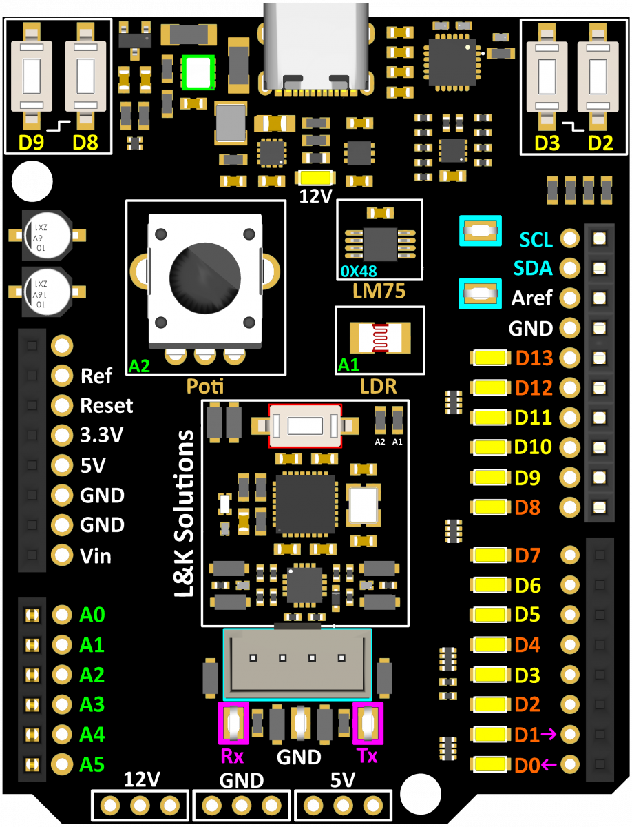Nicht nur für die Abschlussprüfung, auch sonst ist der Uno AP2 eine gute Basis für Projekte verschiedenster Art. Durch den verbauten USB PD Chip können mit kompatiblen Netzteilen direkt 12V angefordert und verwendet werden.
